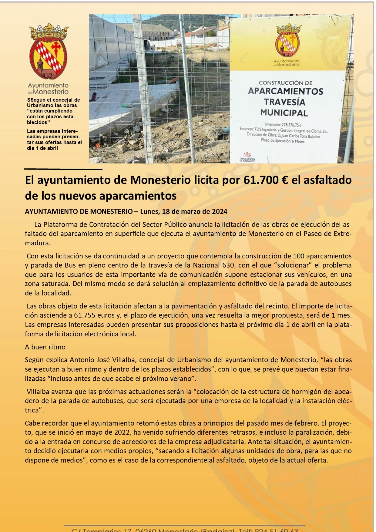 El ayuntamiento de Monesterio licita por 61.700 € el asfaltado de los nuevos aparcamientos