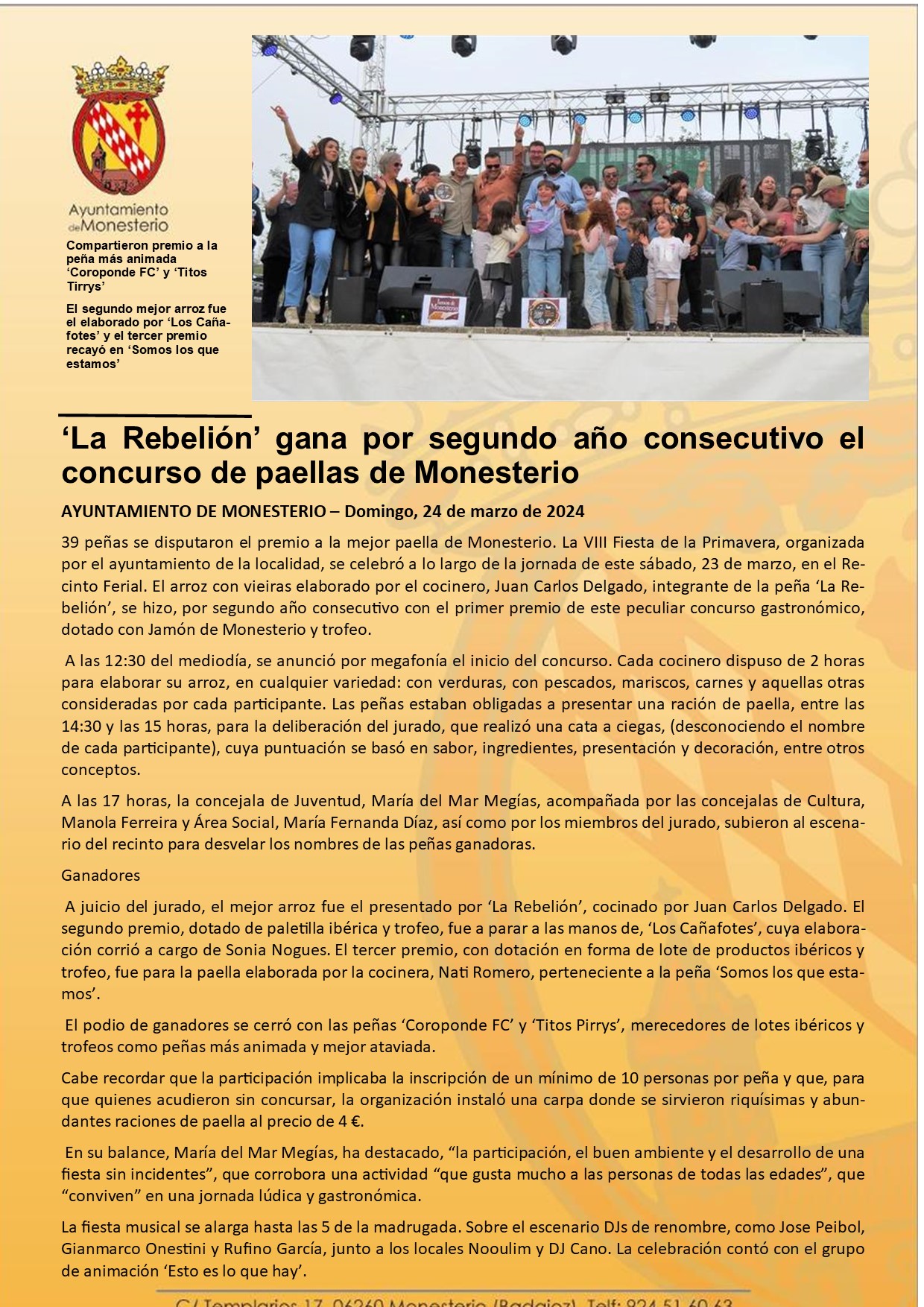 ‘La Rebelión’ gana por segundo año consecutivo el concurso de paellas de Monesterio