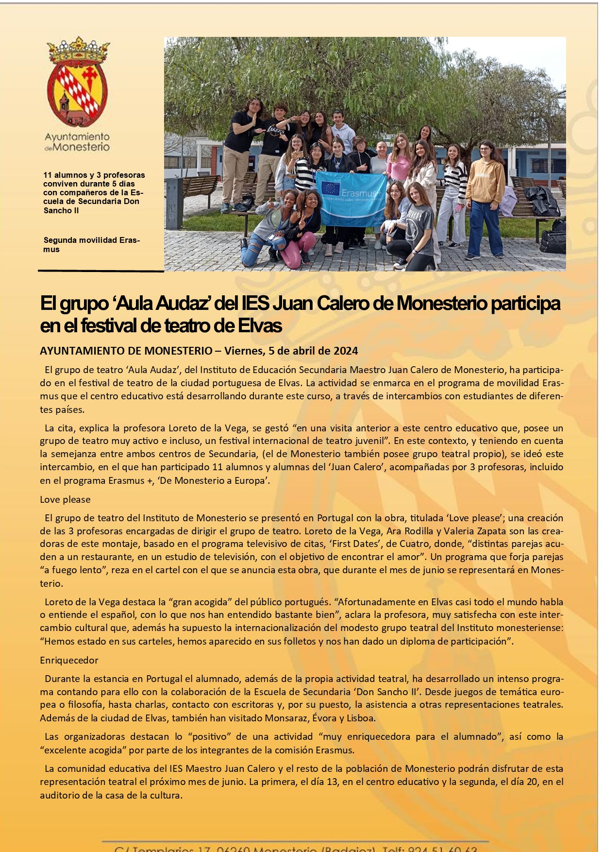 El grupo ‘Aula Audaz’ del IES Juan Calero de Monesterio participa en el festival de teatro de Elvas