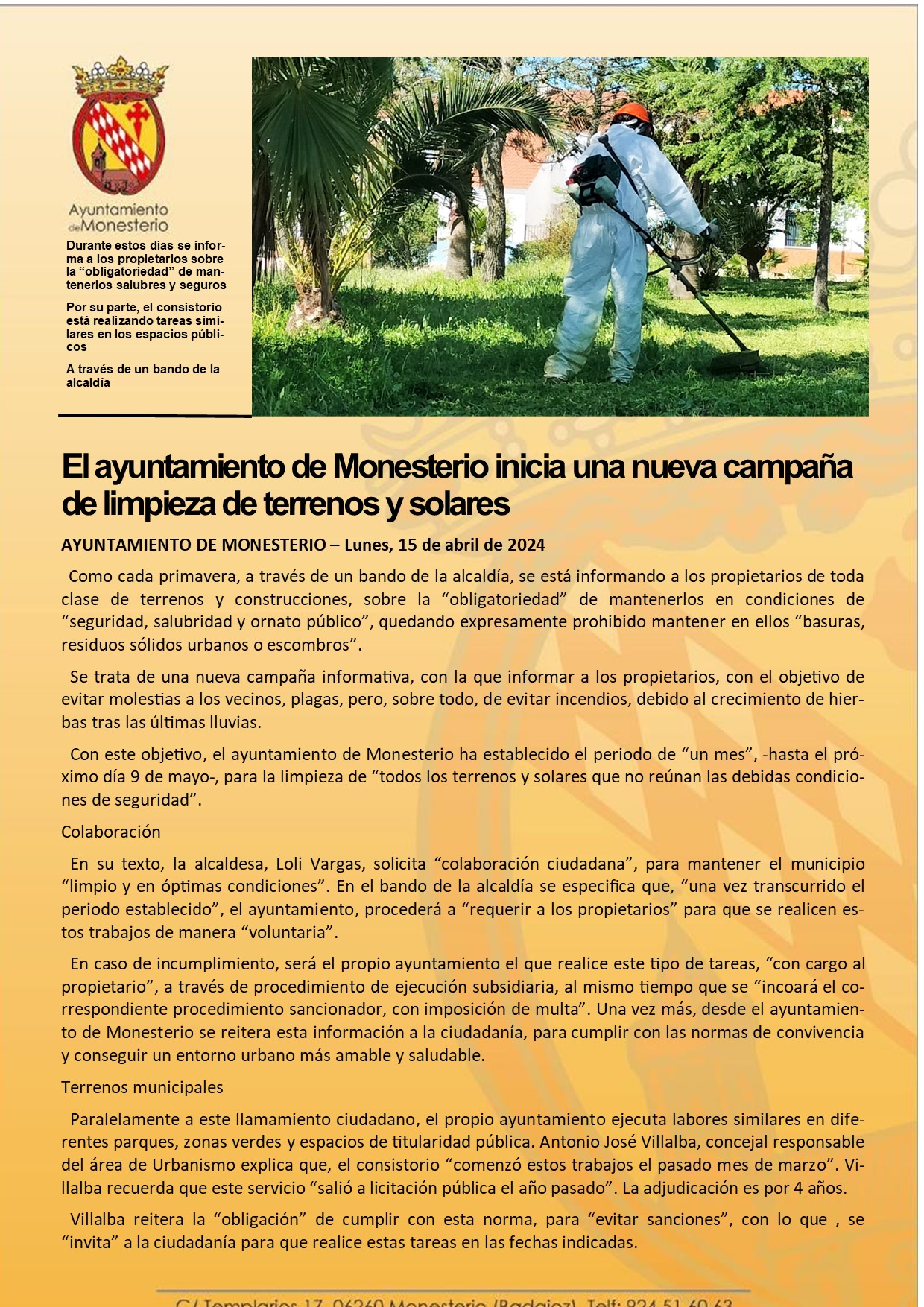 El ayuntamiento de Monesterio inicia una nueva campaña de limpieza de terrenos y solares