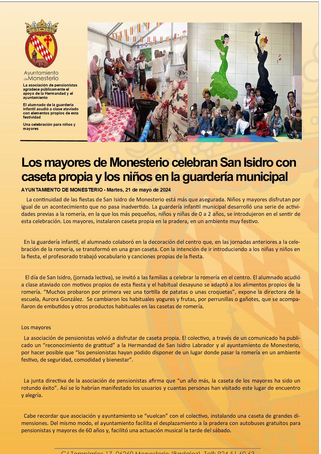 Los mayores de Monesterio celebran San Isidro con caseta propia y los niños en la guardería municipal