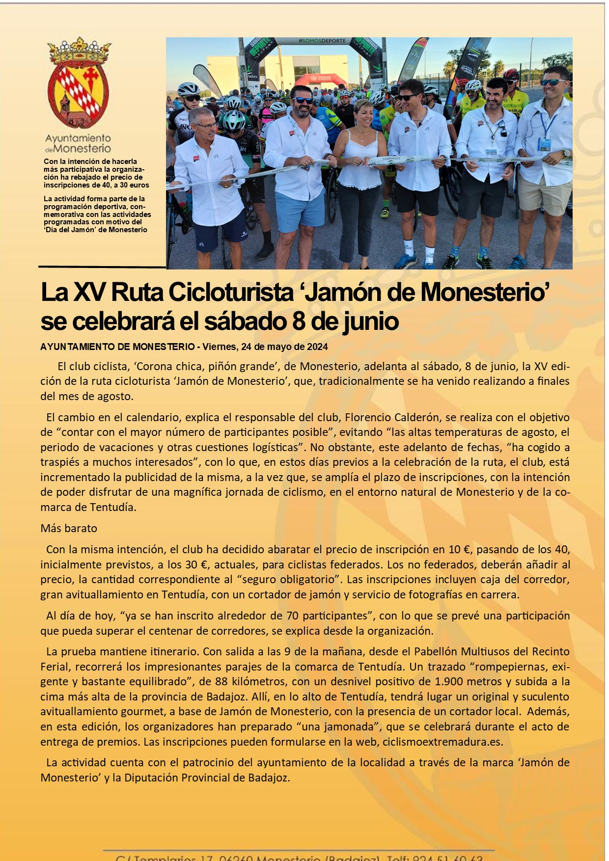 La XV Ruta Cicloturista ‘Jamón de Monesterio’ se celebrará el sábado 8 de junio