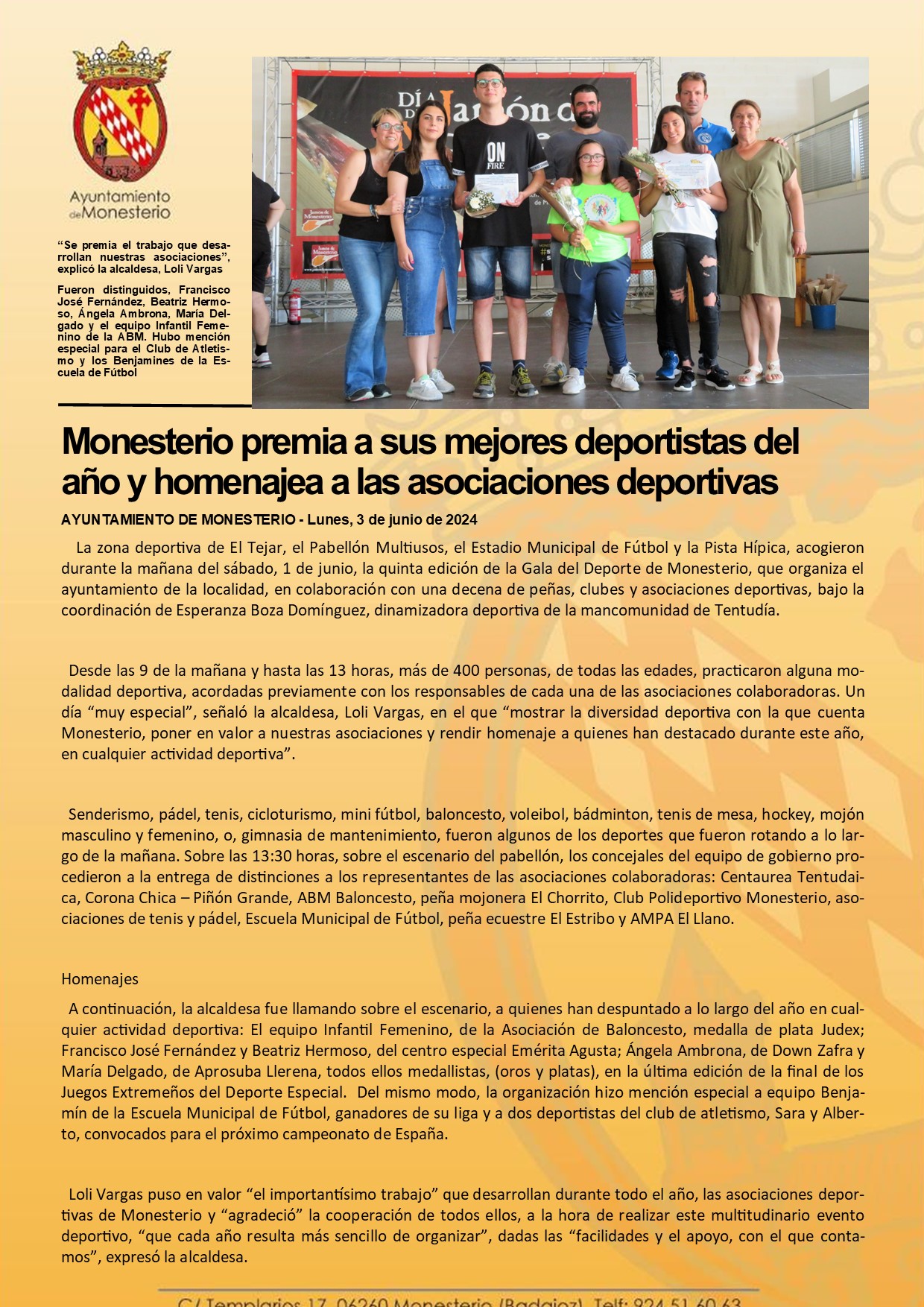 Monesterio premia a sus mejores deportistas del año y homenajea a las asociaciones deportivas