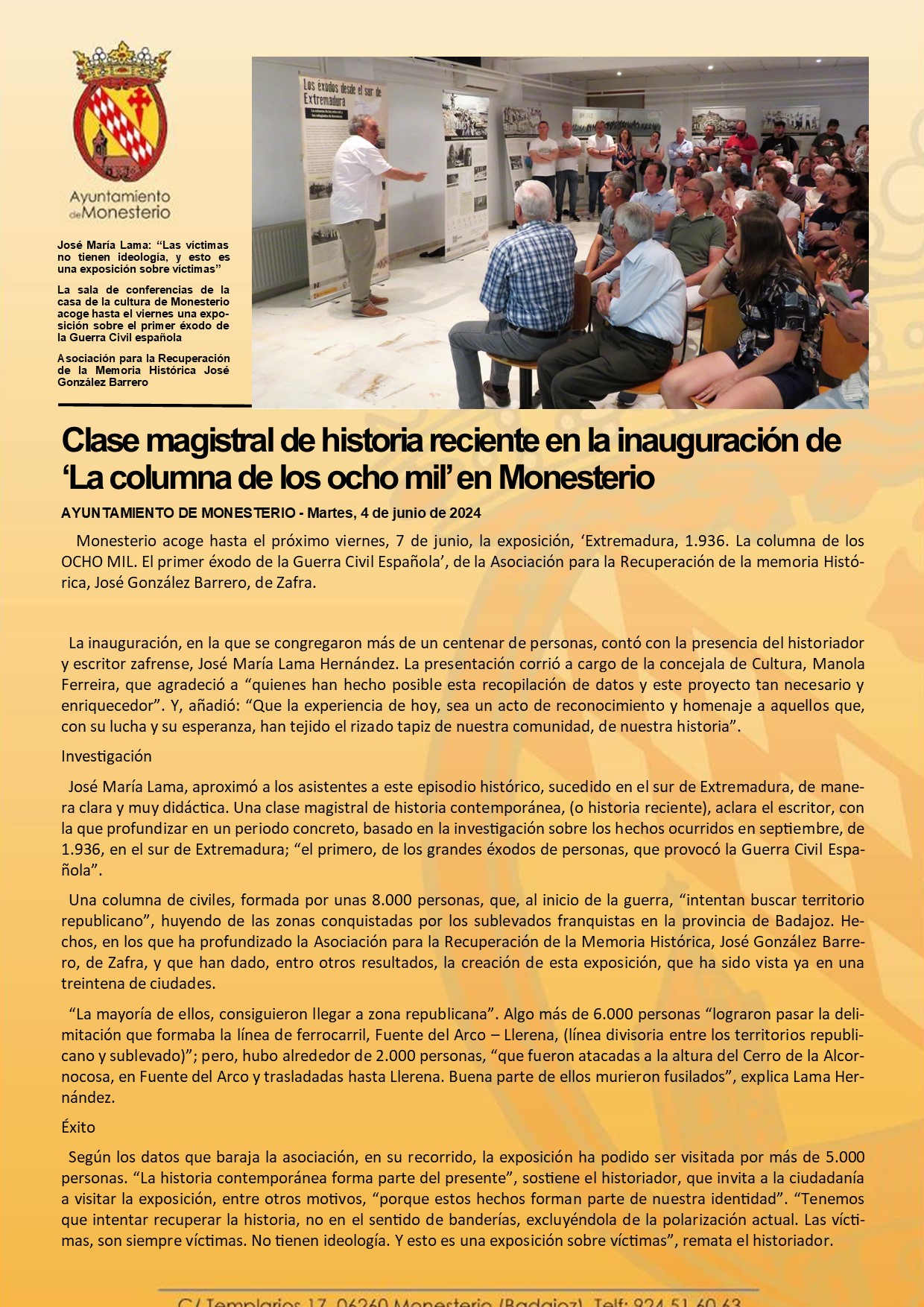 Clase magistral de historia reciente en la inauguración de ‘La columna de los ocho mil’ en Monesterio